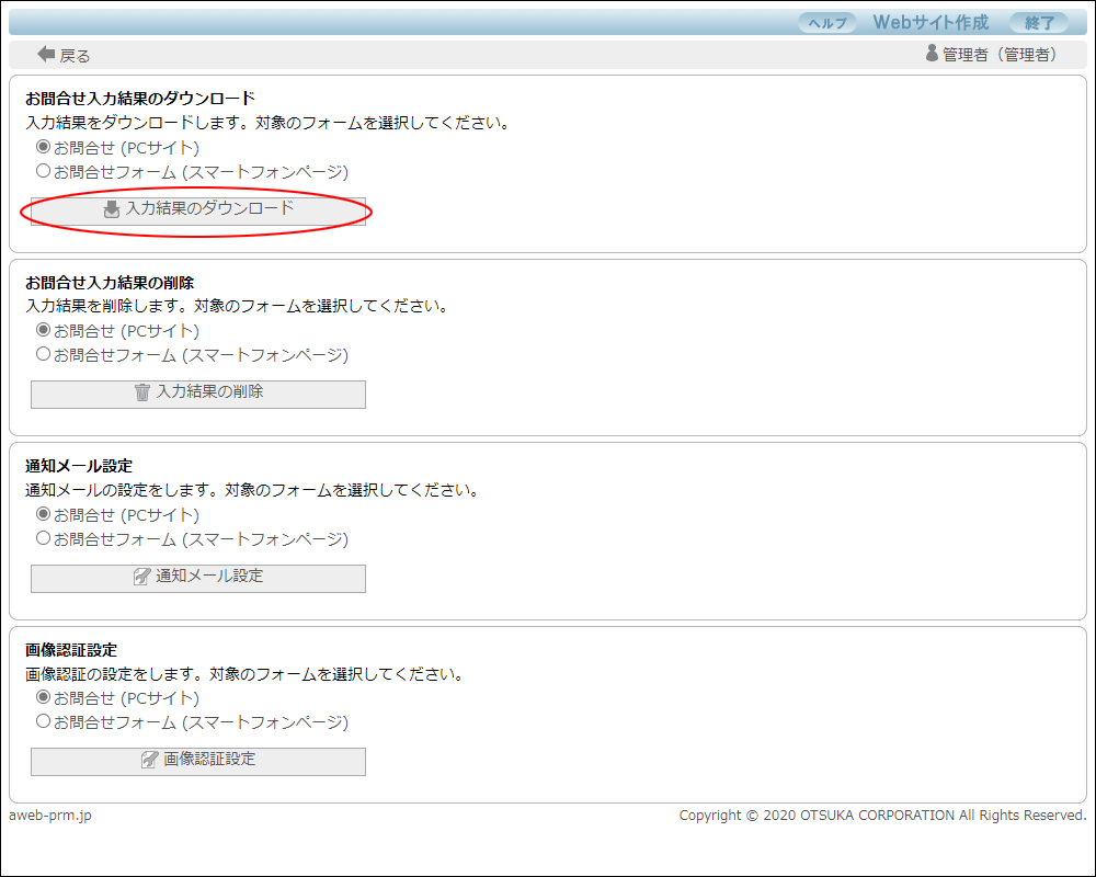 step1 お問合せフォームの管理画面を表示し、「入力結果のダウンロード」ボタンをクリックします。