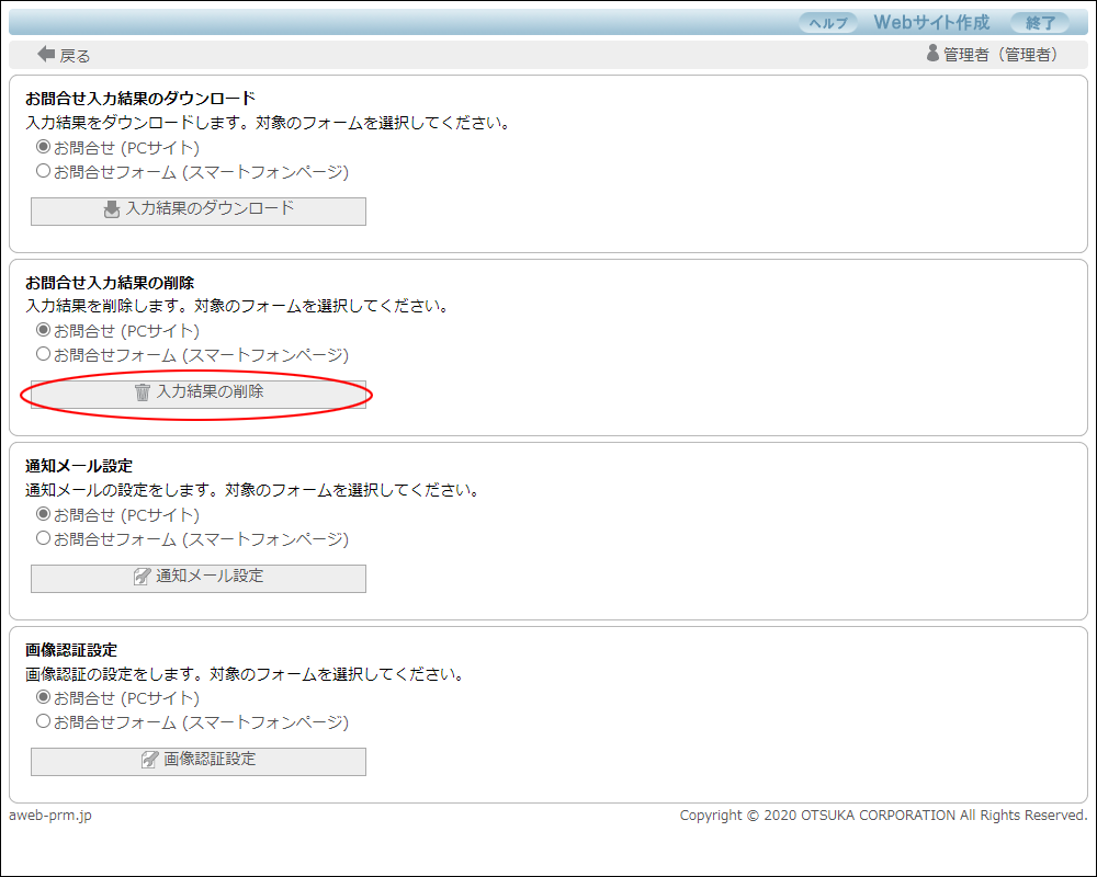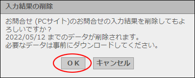 step1 お問合せフォームの管理画面を表示し、「入力結果の削除」ボタンをクリックします。