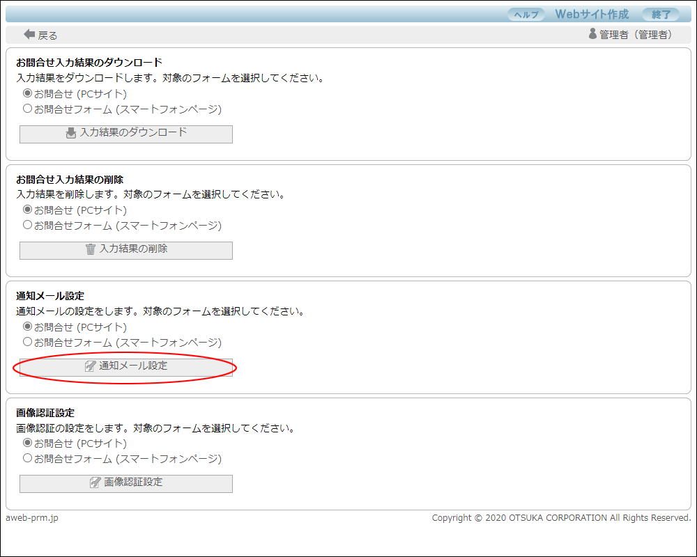 | 通知する(通知のみ) | お問合せがあったことを、お問合せメールで通知します。(お問い合わせの内容は通知しません) |
