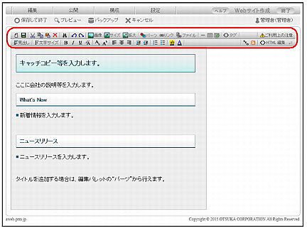 | HTML編集 | HTML 編集画面が表示されます。HTMLタグを直接入力して内容を編集できます。 ※HTMLタグを入力して内容を編集した場合は、本機能の動作保障外となります。 |