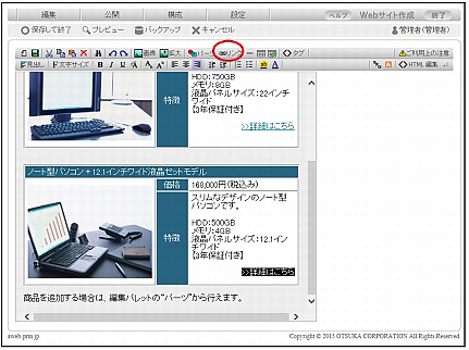 step1 ページ編集画面を表示し、リンクに設定する文字列やボタンを選択して