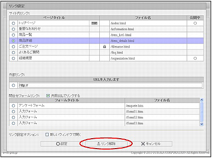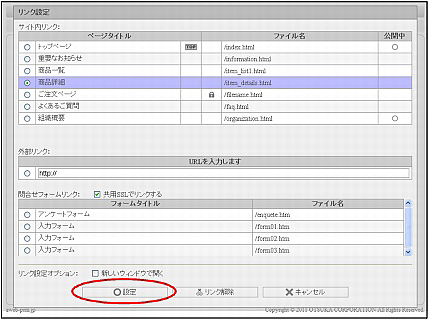 | サイト内リンク | リンクさせる、Webサイト内のページを選択します。 |