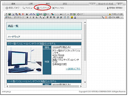 編集中のページのバックアップや、バックアップデータの復元を行います。また、作成したバックアップデータの削除を行うこともできます。