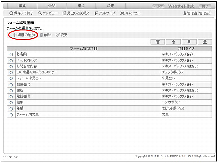 step1 フォーム編集画面を表示し、「項目の追加」をクリックします。