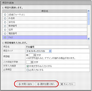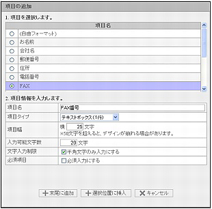 お問い合わせフォーム(自由設定)の場合、一覧にない項目を追加するときは、「(自由フォーマット)」を選択してください。