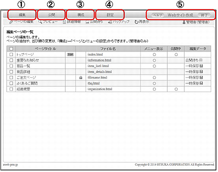 | 編集ページの一覧 | ページの内容を編集します。また、バックアップデータの作成や、SEO対策キーワード、RSS記事の設定を行います。 | 「編集ページの一覧画面を表示する」~「編集中ページのバックアップ操作を行う」 「お問合せフォームを編集する」~「スマートフォンページを編集する(スマートフォンページトップ)」 |