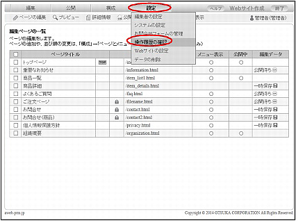 step1 Webサイト作成画面を表示し、「設定」→「操作履歴の確認」の順にクリックします。
