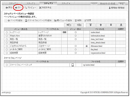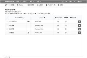 | 削除 | 選択したページを削除します。詳しくは、「ページを削除する」をご覧ください。 ※トップページに設定されたページは削除できません。 |