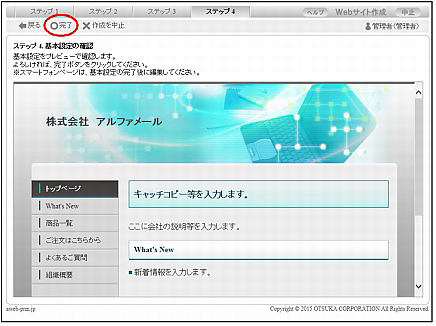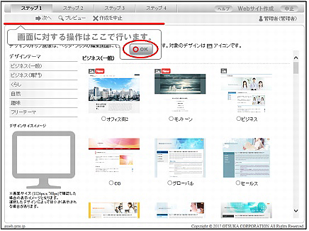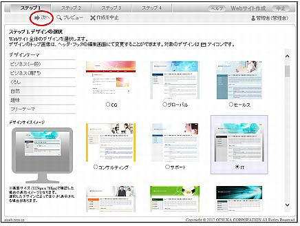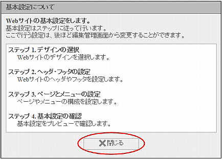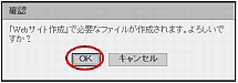 | 作成を中止 | Webサイトの作成を中止します。クリックすると「ウイザード中止確認」が表示されますので、「OK」ボタンをクリックしてください。 |