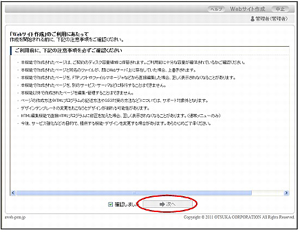 「「Webサイト作成」のご利用にあたって」画面が表示されます。