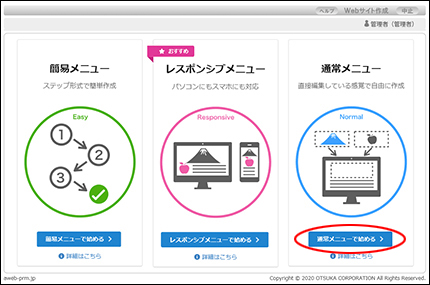 まず通常メニューを選択してから、ウイザード形式でWebサイトの基本設定を行っていきます。4つのステップで、簡単にWebサイトを作成することができます。