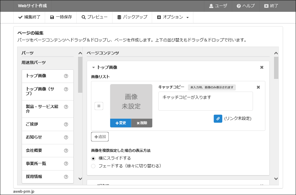 追加する場合、追加するパーツを選択し、ページコンテンツへドラッグ&ドロップするか、