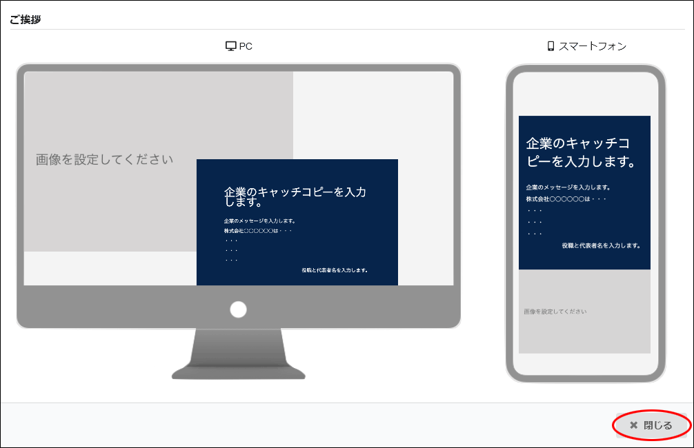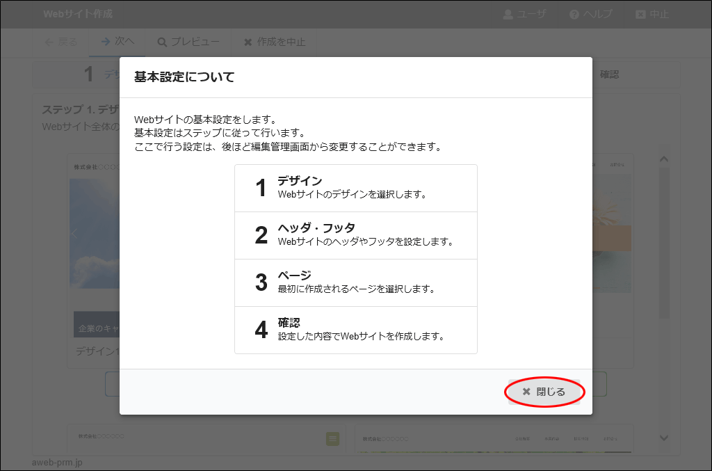 step4 Webサイトの基本設定の流れを確認し、「閉じる」ボタンをクリックします。