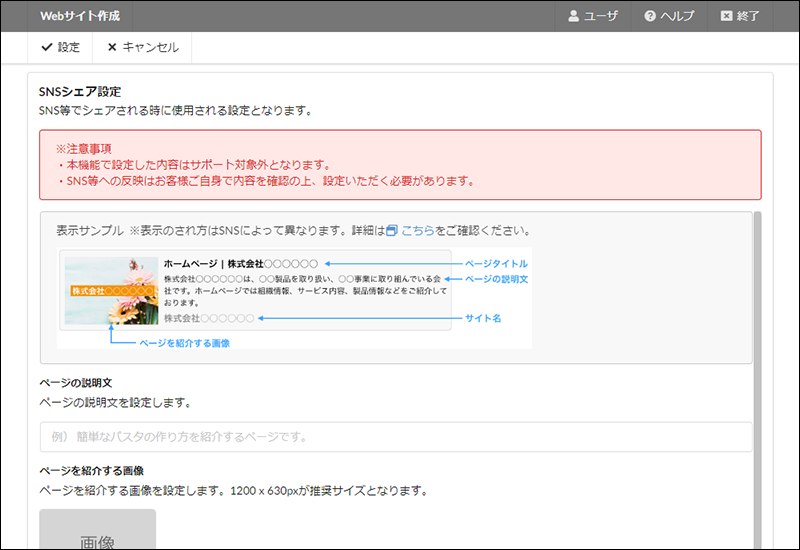 SNSなどでお客様のWebサイトがシェアされる際に表示される画像や説明文を設定することができます。
