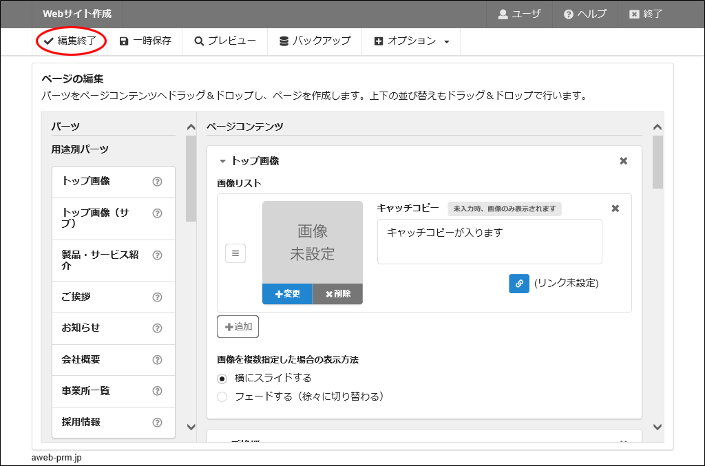 パーツの表示順を変更する場合、パーツ上下の![]()
