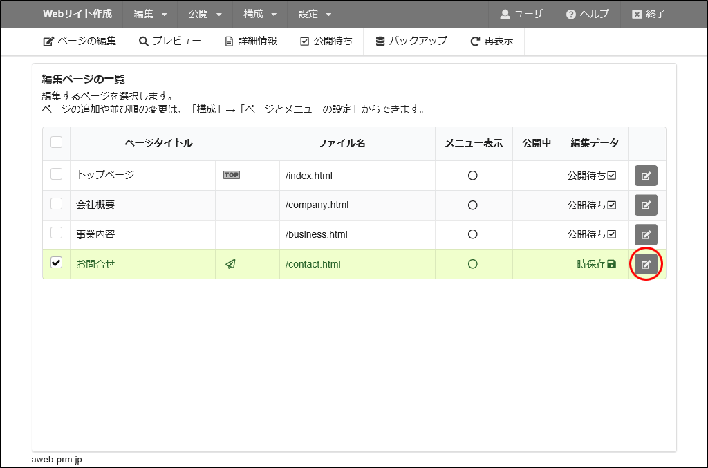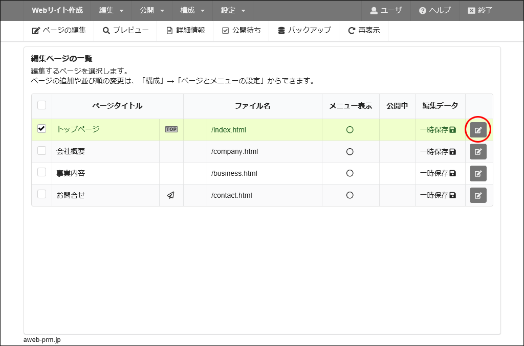 step7で選択したページが一覧に表示されています編集するページの