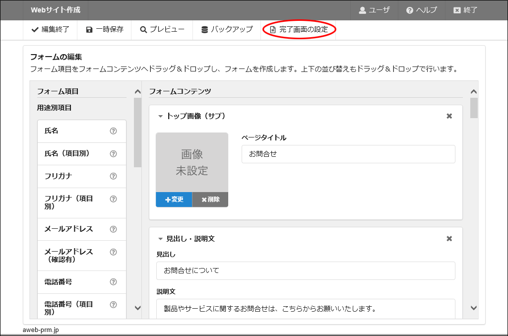 編集作業が完了しましたら、「完了画面の設定」をクリックします。