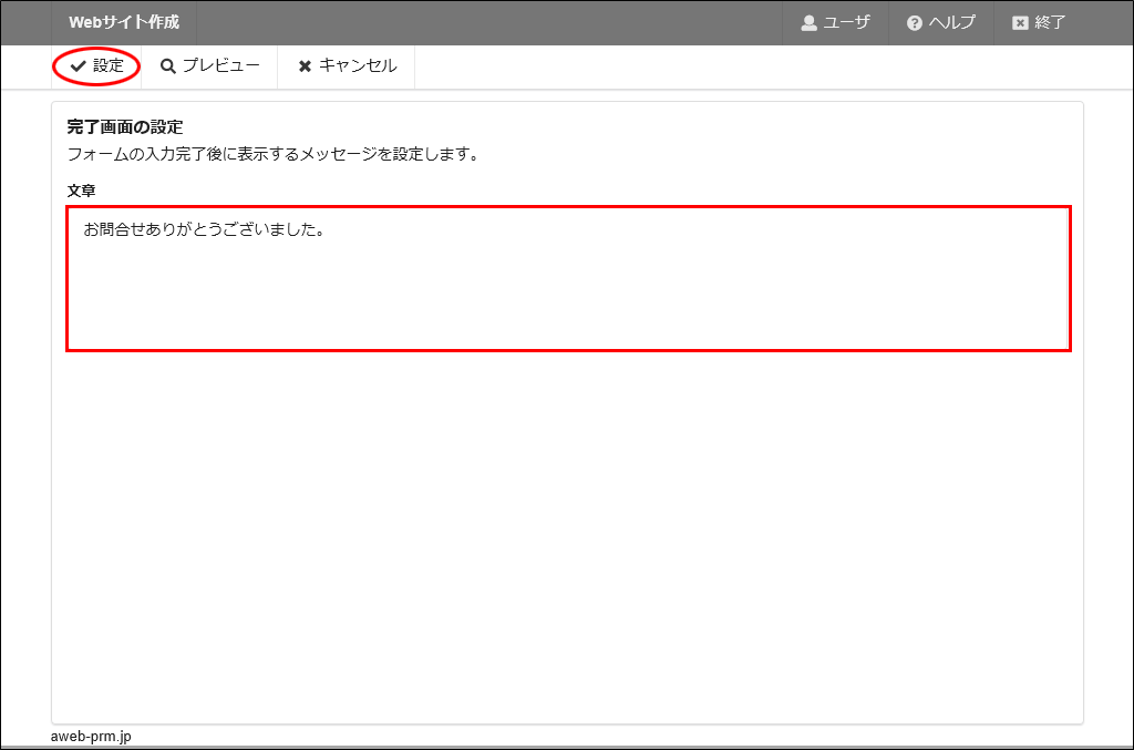 step15 完了画面に表示する文章を入力し、「設定」をクリックします。
