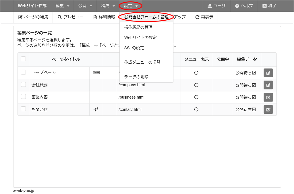 お問合せページ以外のすべてのページ編集が完了しましたら、「お問合せ」の