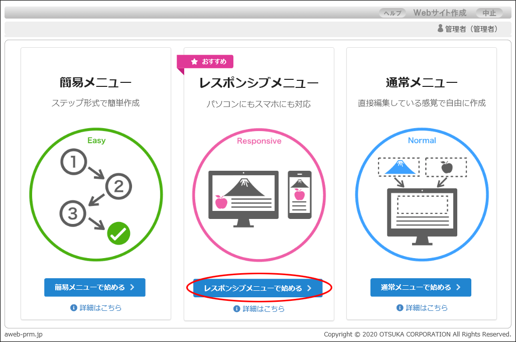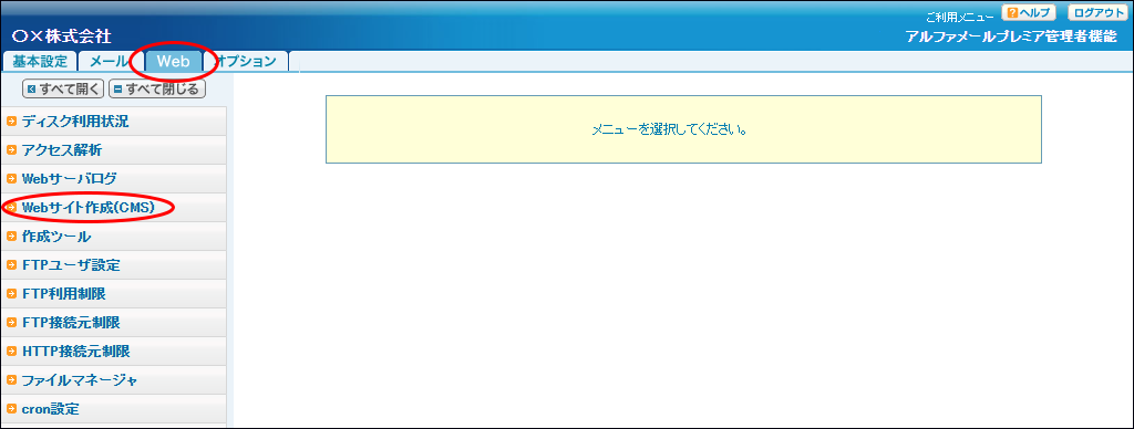 step1 管理者機能にログインし、「Web」をクリックし、「 Webサイト作成(CMS) 」をクリックします。