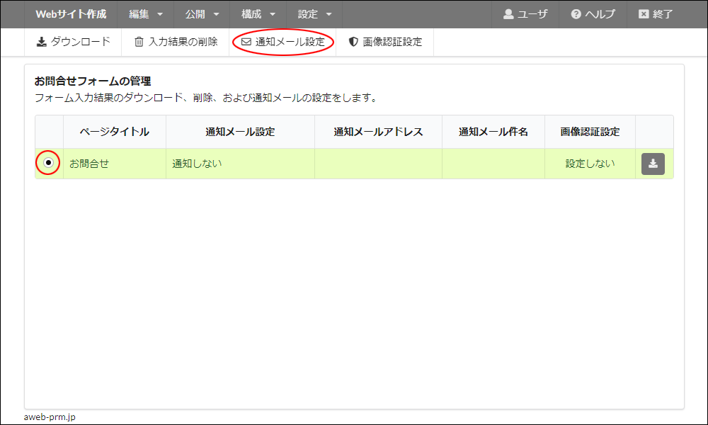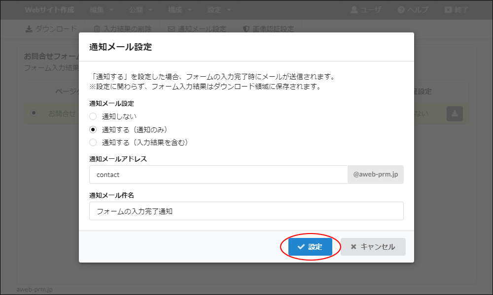 step18 対象のお問合せフォームを選択し、「通知メール設定」をクリックします。