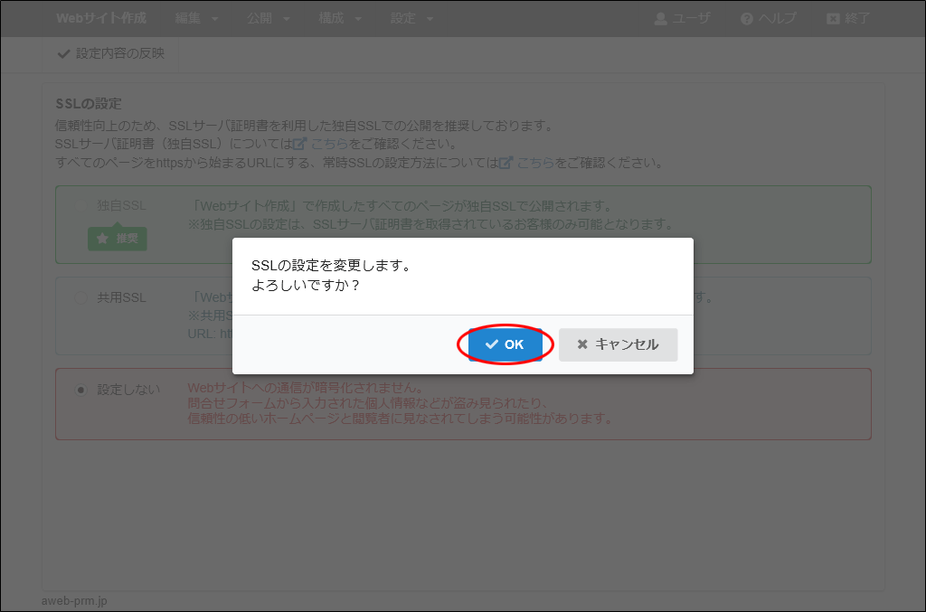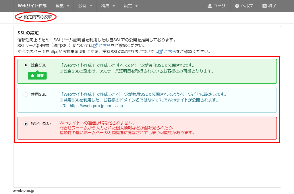 step23 SSLの設定を選択し、「設定内容の反映」をクリックします。