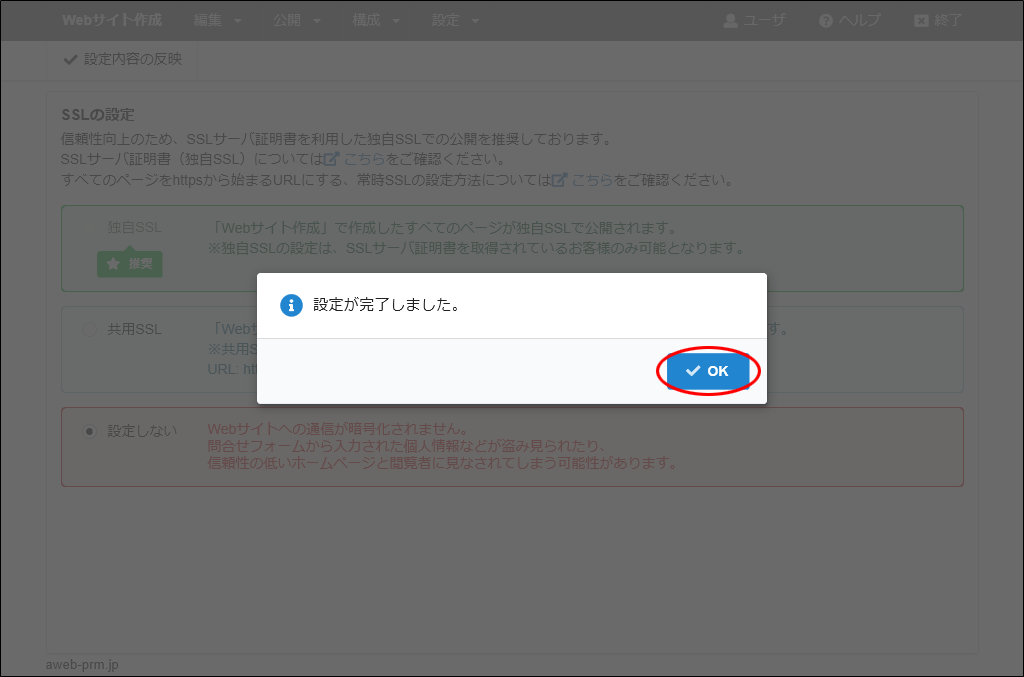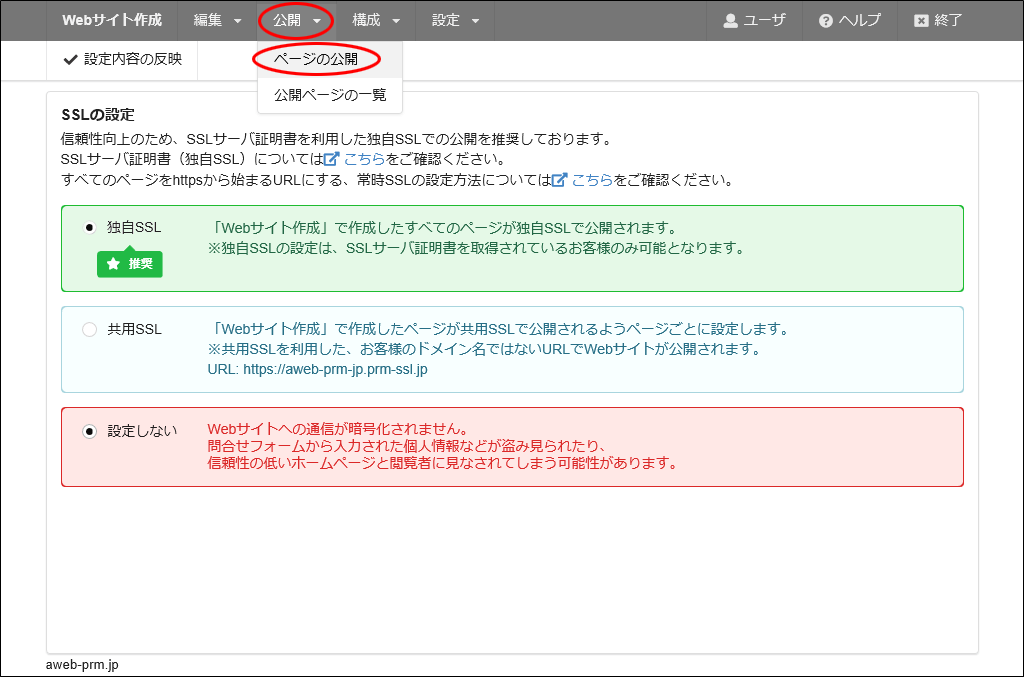 現在独自SSL証明書を未取得でもstep13~21で「お問合せ」ページを作成された場合は、共用SSLを選択して「お問合せ」ページを公開するようにしてください。