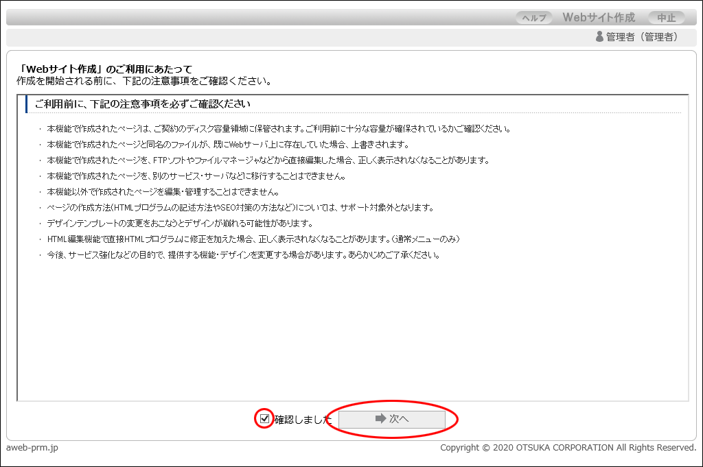 「Webサイト作成」のご利用にあたって」画面が表示されます。