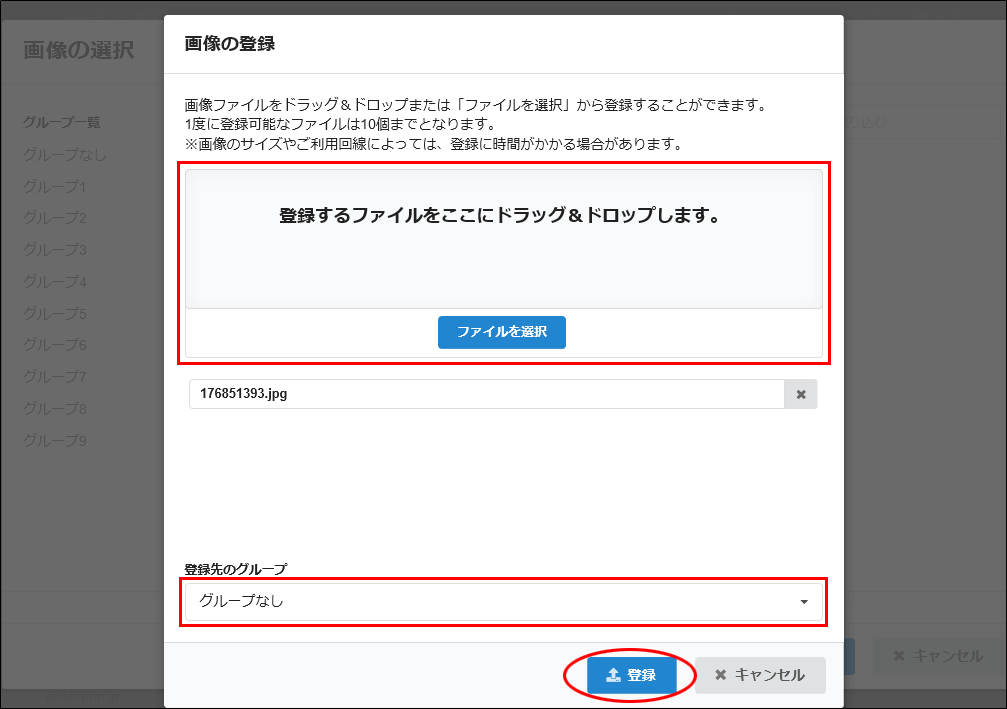 「登録先のグループ」を選択し、「登録」ボタンをクリックします。