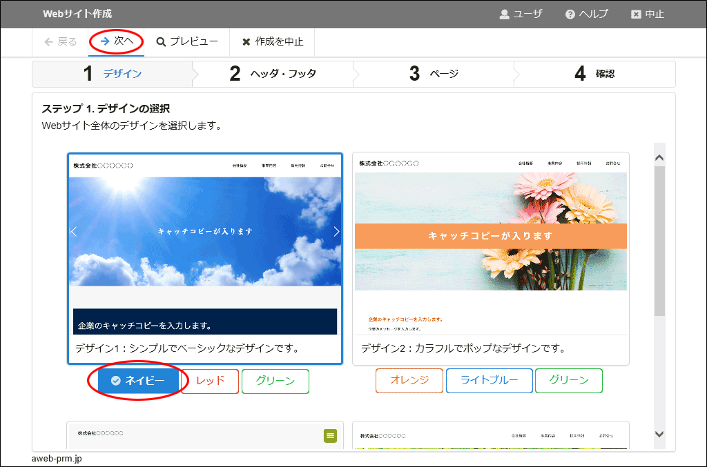 step5 設定したいデザインのカラーを選択し、「次へ」をクリックします。