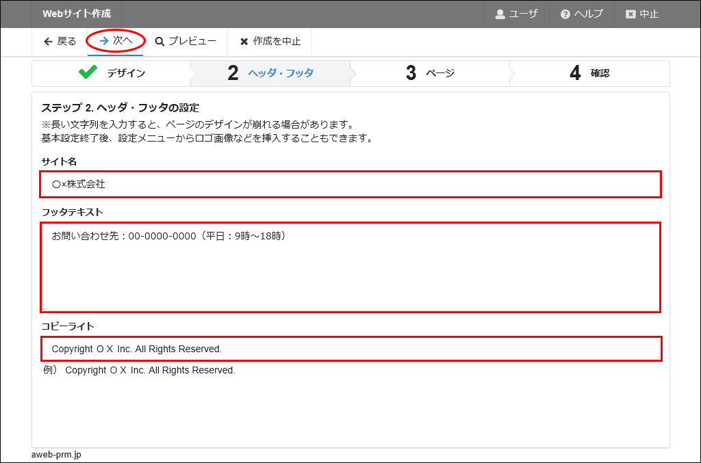 | フッタテキスト | Webサイトのフッタに表示する内容を入力します。 |