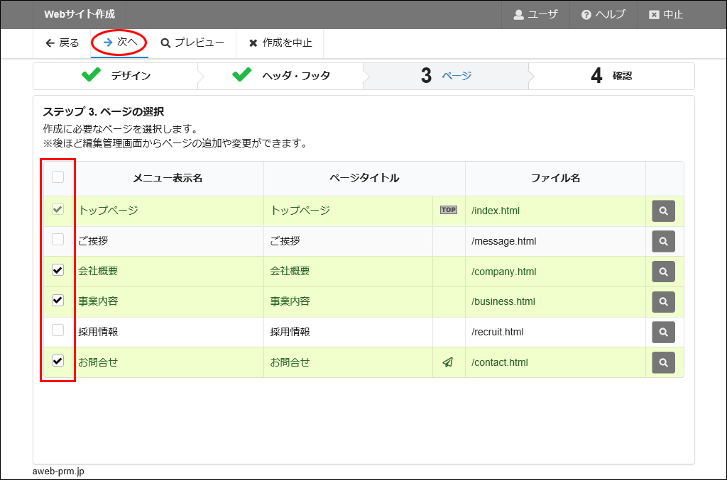 ※ここでは、例としてトップページの他に、「会社概要」「事業内容」「お問合せ」のページを選択しています。以降の手順はこちらのページを選択した場合を例に説明しています。