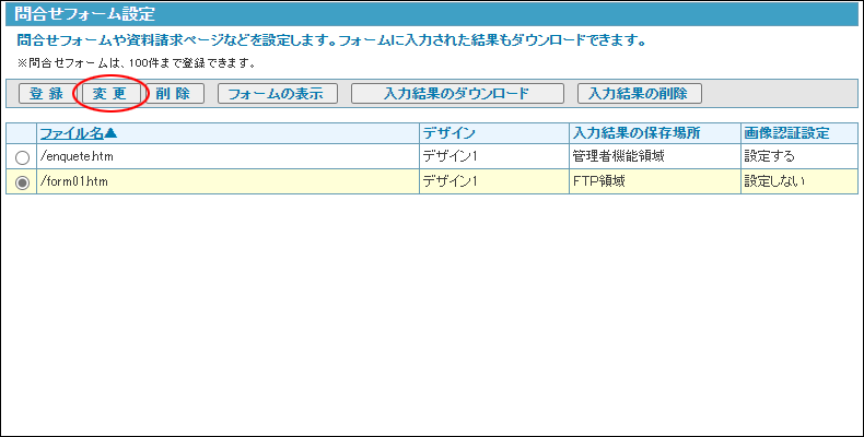 step1 問合せフォーム画面を表示し、変更するフォームを選択して「変更」ボタンをクリックします。