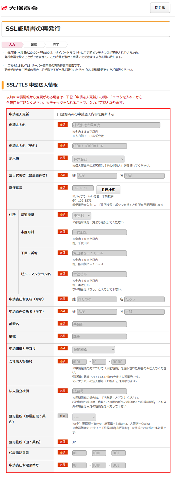 | 申請法人更新 | SSL申請法人情報を更新する場合は、チェックボックスにチェックを入れ、更新してください。 |