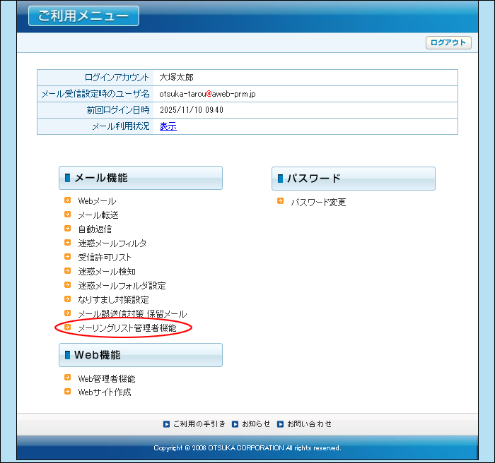 step1 ご利用メニューを表示し、「メーリングリスト管理者機能」をクリックします。
