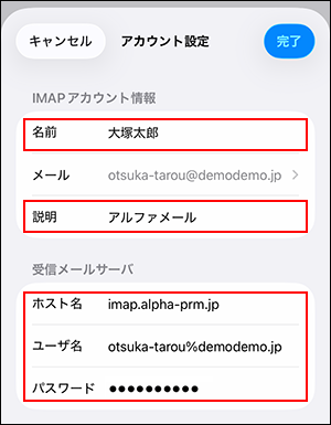 IMAPアカウント情報 名前 名前や会社名などを入力 -