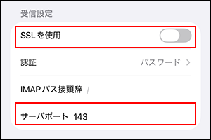SSLを使用 「オン」を選択 認証 「パスワード」を選択 サーバポート 経路暗号化あり(IMAP over SSL) 「993」を入力 -