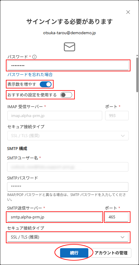 表示数を増やす 「オン」を選択 おすすめの設定を使用する 「オフ」を選択 SMTP構成 SMTP送信サーバー 「smtp.alpha-prm.jp」を入力 -