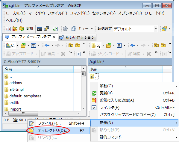 サーバ側(右画面)で右クリックし、「新規」→「ディレクトリ」を選択します。