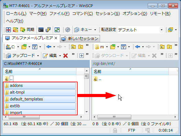 ローカル側(左画面)のファイルを全て選択し、サーバ側(右画面)にドラッグ&ドロップします。