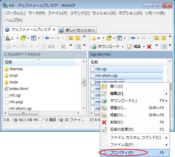 サーバ側(右画面)のスクリプト(拡張子: cgi)ファイルを全て右クリックで選択し、「プロパティ」を選択します。