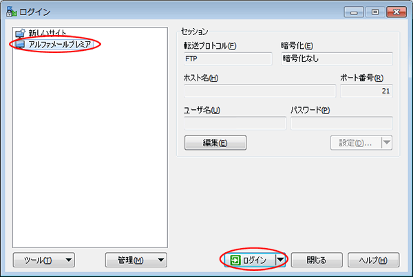FTPソフトを起動し、アルファメールプレミアのセッション名を選択します。