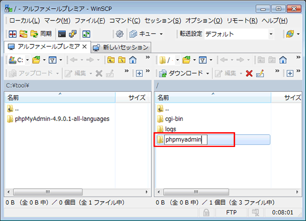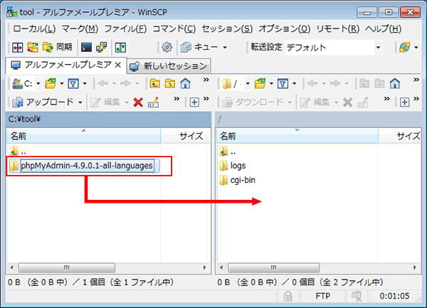 ローカル側(左画面)のphpMyAdminのフォルダを選択し、サーバ側(右画面)にドラッグ&ドロップします。
