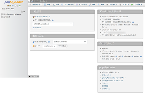 • パスワードがご不明な場合、「管理者機能ページ」→「Web」→「MariaDB」→「データベース一覧」で変更できます。