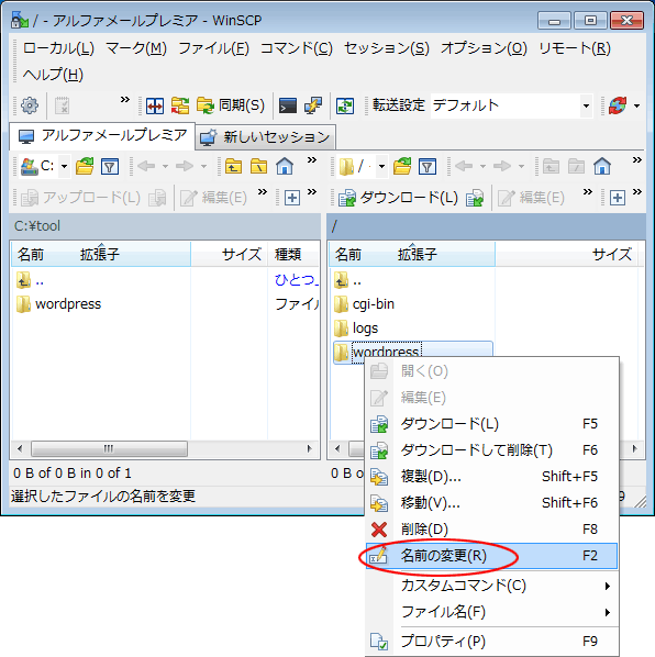 サーバ側(右画面)wordpressのフォルダを右クリックし、「名前の変更」をクリックします。