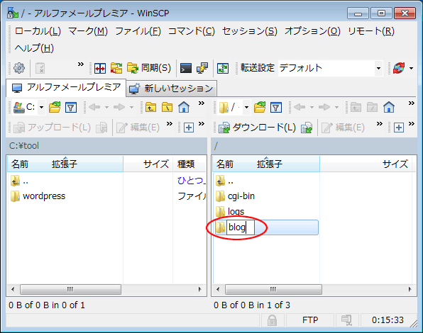 ローカル側(左画面)wordpressのフォルダを選択し、サーバ側(右画面)にドラッグ&ドロップします。