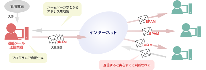 迷惑メールとは、主に商品の広告宣伝などを目的として一方的に送信されてくるメールのことを指します。郵便などを使ったダイレクトメールと異なり、ほとんど費用をかけずに大量のインターネット利用者宛てに送ることができるため、悪用されるケースが増えています。