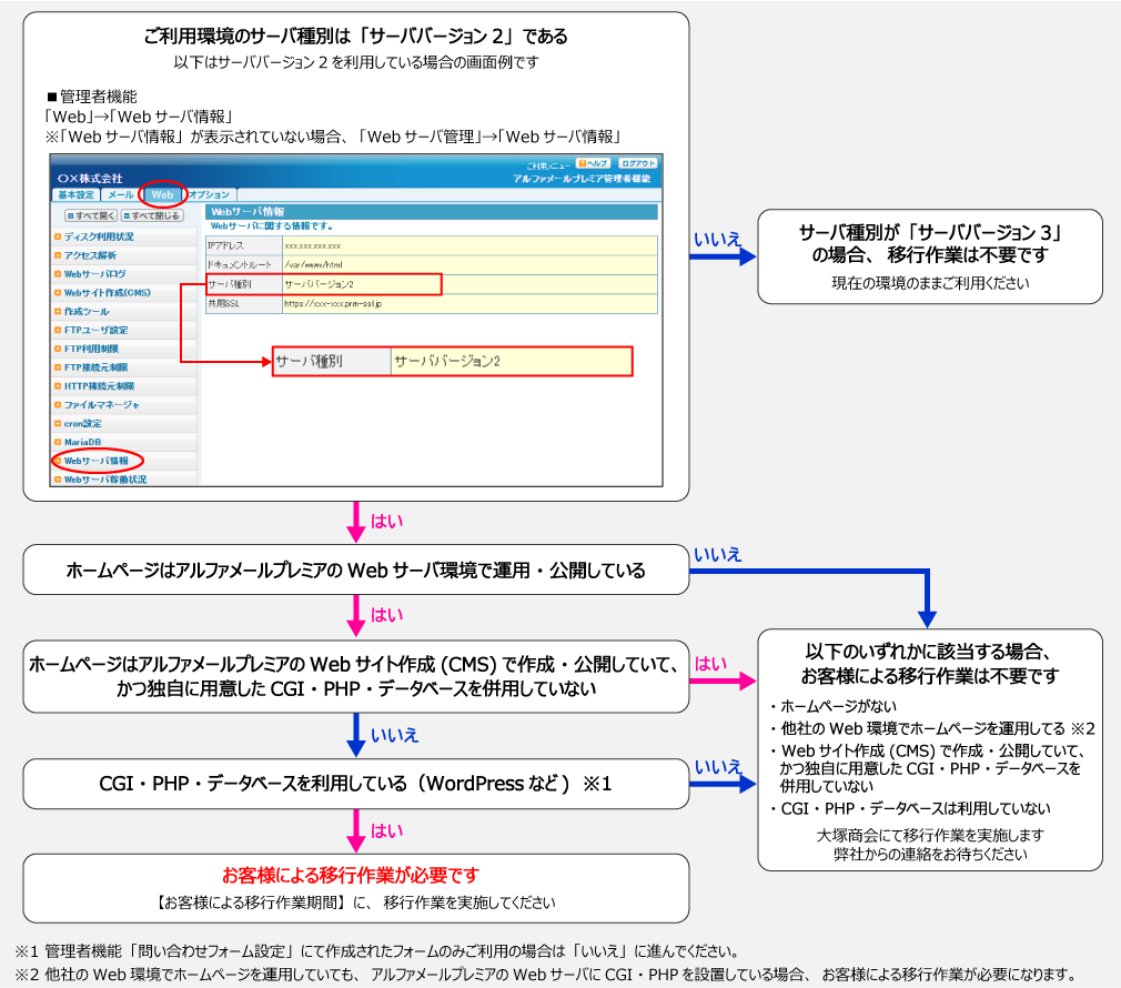 「Webサーババージョン2」から「Webサーババージョン3」への切替えにはデータ移行が発生しますが、お客様側で切替えのお申し込みや移行作業を行う必要があるかどうかはホームページのご利用条件により異なります。